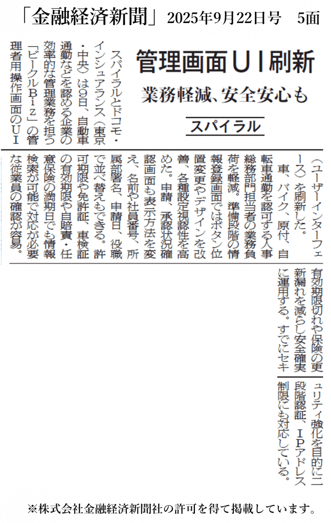 金融専門紙「金融経済新聞」2025年9月22日号5面にマイカー通勤管理クラウド「ビークルBiz」supported by ドコモ・インシュアランスの管理画面UIリニューアルに関する記事が掲載されました