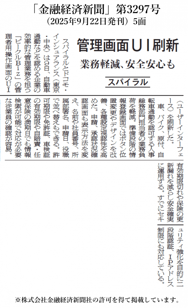 金融専門紙「金融経済新聞」第3297号(2025年9月22日発刊)5面にマイカー通勤管理クラウド「ビークルBiz」supported by ドコモ・インシュアランスの管理画面UIリニューアルに関する記事が掲載されました
