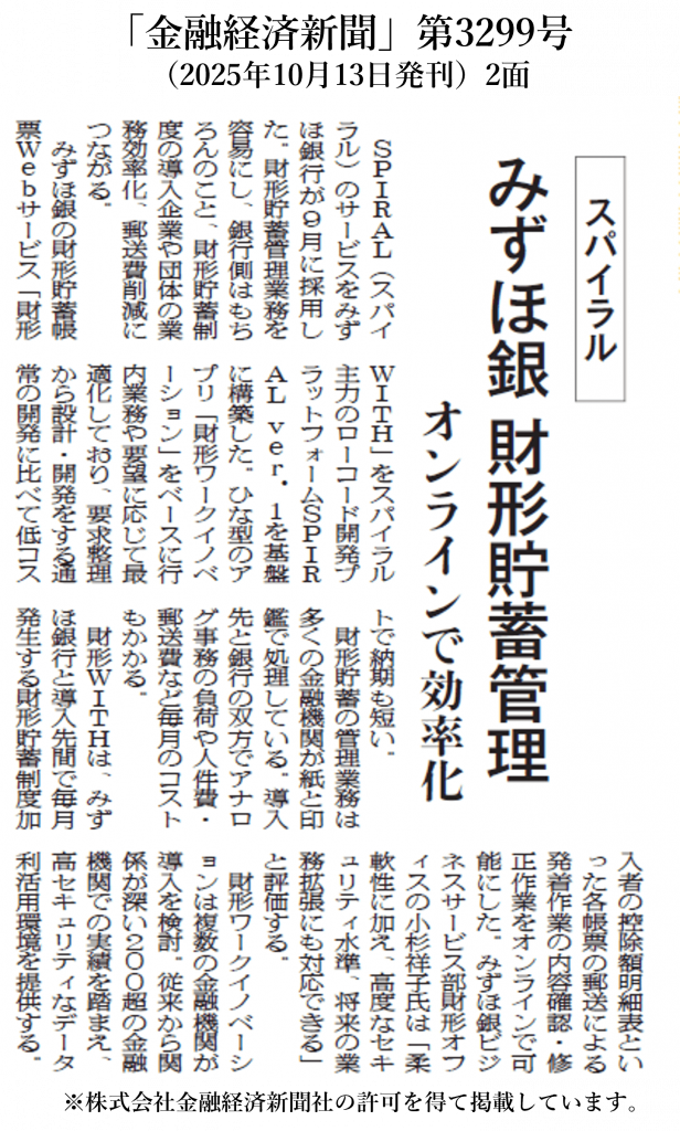 金融専門紙「金融経済新聞」第3299号(2025年10月13日発刊)2面に当社顧客の「SPIRAL」採用事例に関する記事が掲載されました