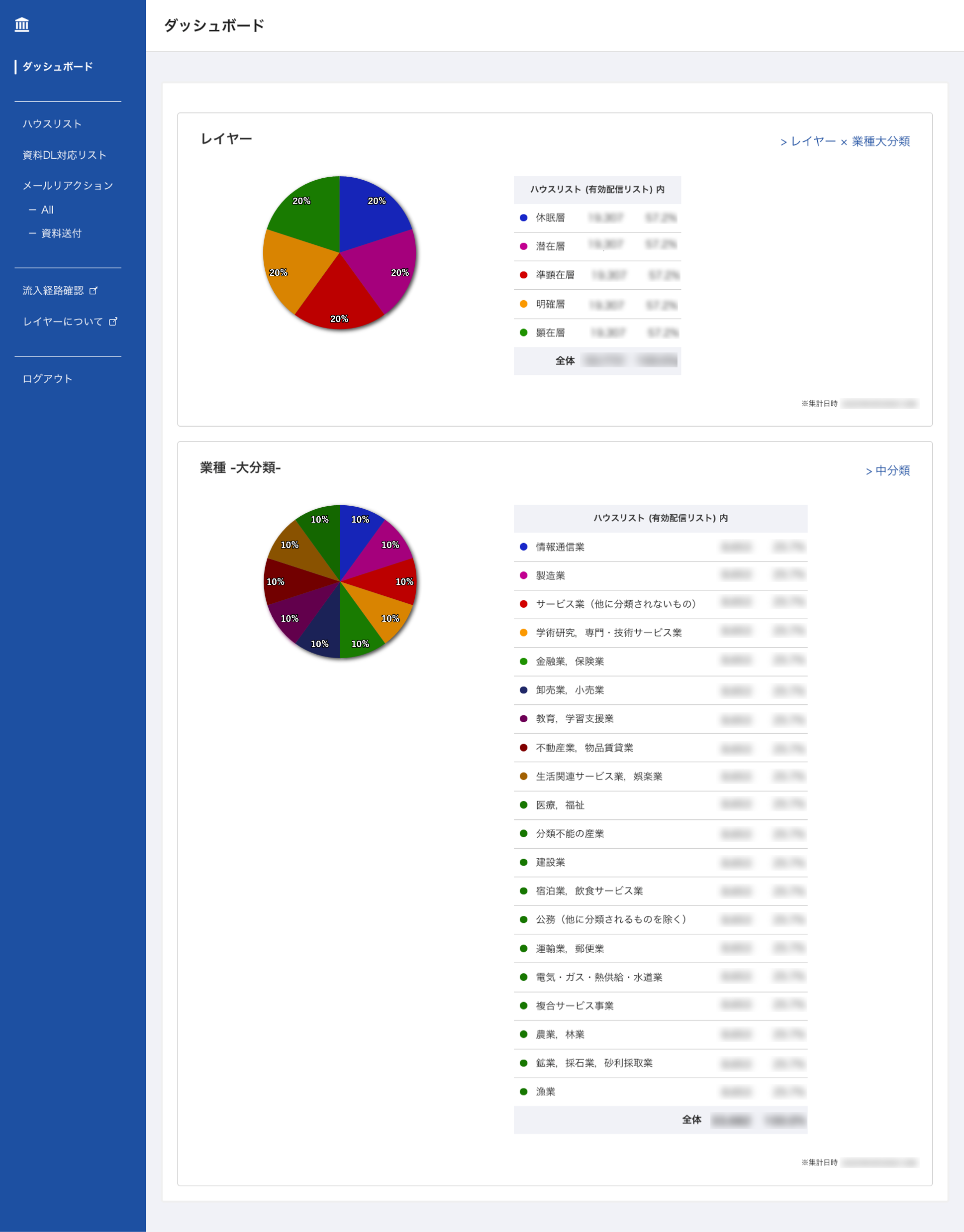 取得したお客様の企業属性や行動履歴、関心度などのデータは自動集計・可視化され、アプリ内で一元管理されます。メールで送付した資料やメルマガへの反応状況など、お客様の関心領域や傾向も統合的に把握できるようになっており、営業・マーケティング活動を多面的に支援します。
