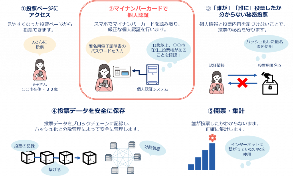 マイナンバーカードの公的個人認証を活用し、時間や場所を問わず「1人1票」を厳格かつ安全に実現するシステムです。ブロックチェーン技術により、投票内容の秘密保持とデータの非改ざん性を高いレベルで担保しています。2018年からのつくば市での実証事業に基づき、自治体や企業等の選挙運営を導入から実施までトータルでサポートします。