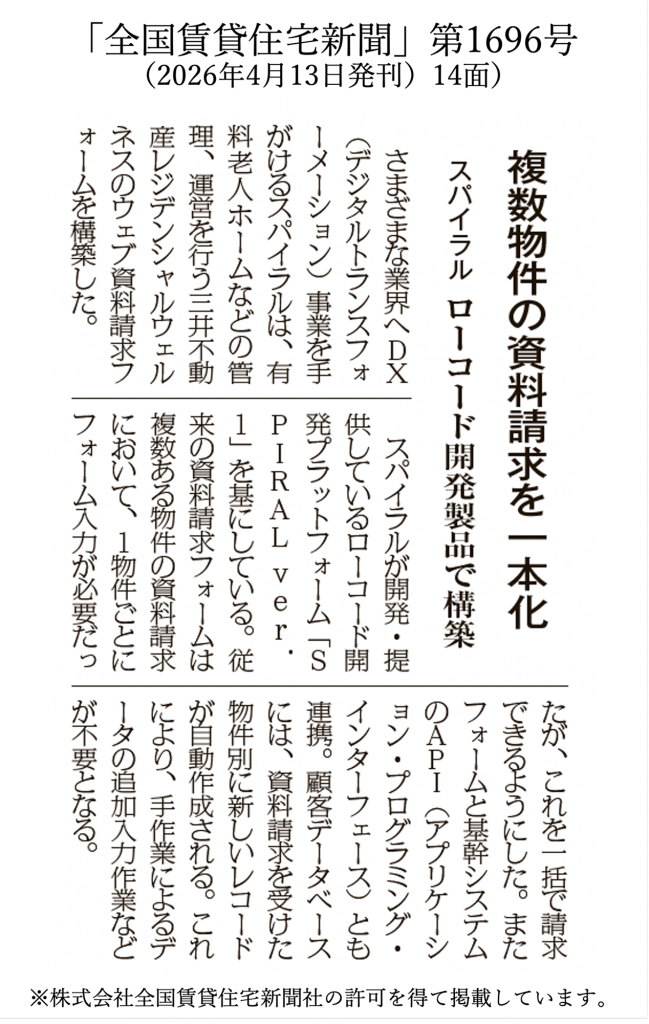 賃貸住宅管理業界向けの専門紙「全国賃貸住宅新聞」第1696号(2026年4月13日発刊)14面に当社顧客の「SPIRAL ver.1」導入事例が掲載されました