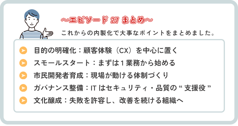 内製化してみたら、思ってもみなかった問題点が出てくることもあるし、内製化はスモールスタートが重要だよね。成功体験を作って、そこから広げていくのが良いということだね。