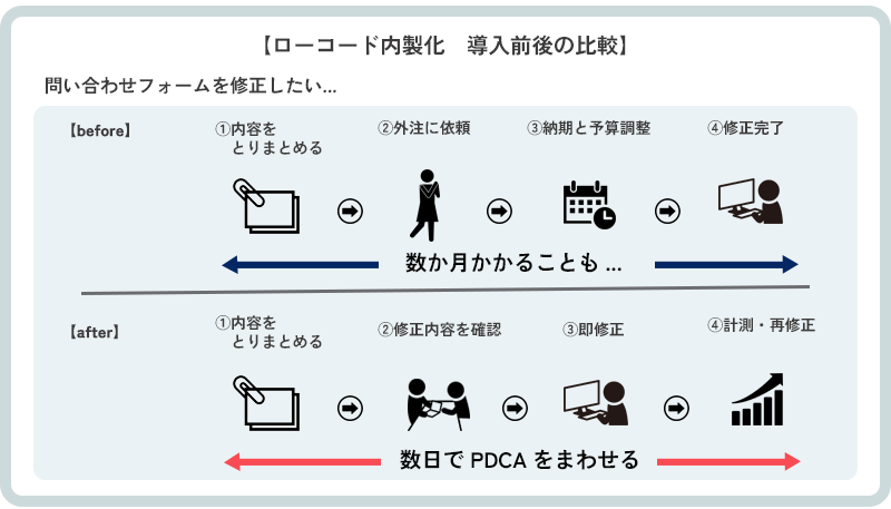 確かになぁ。だから最近、外部に依頼せずに社内での“ローコード内製化”が流行ってるんかな?現場が自分らで直せるようになると、顧客接点の強化につながる…って誰かが言うてたけど、ほんまにそんなに変わるんか?