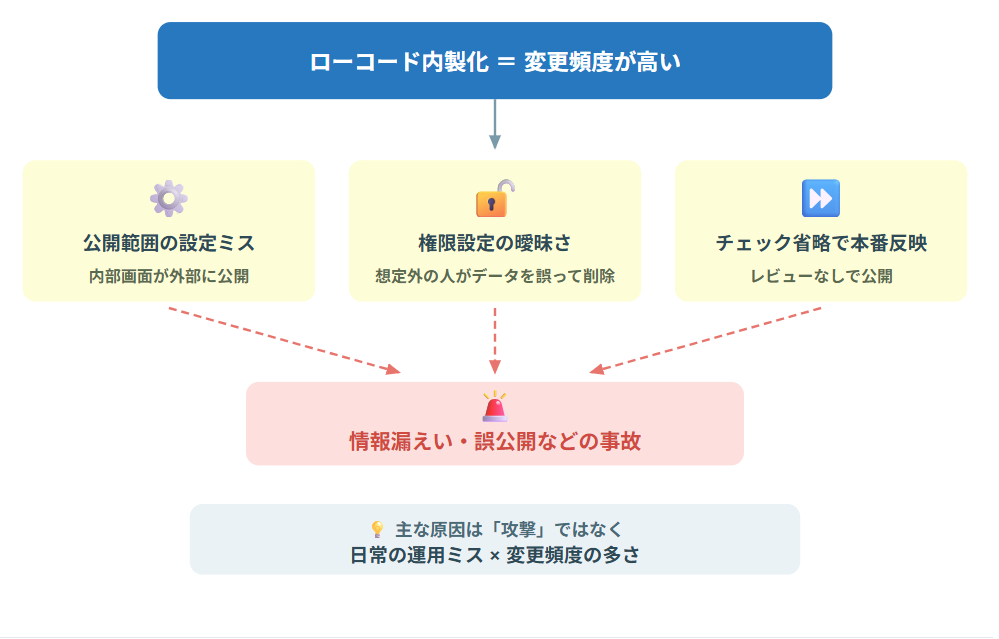 顧客接点業務では日常で扱う個人情報がとても多いんです。しかもローコードで内製化すると、フォームの項目追加や文言修正がすぐできるので、変更の回数が自然と増えるんです。一つひとつは小さな変更でも、そのたびに設定ミスや権限ミスが起きる可能性がある。だから事故につながりやすい領域なんです。