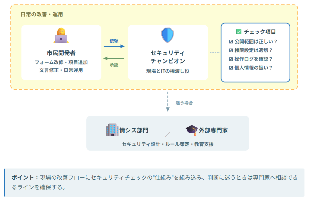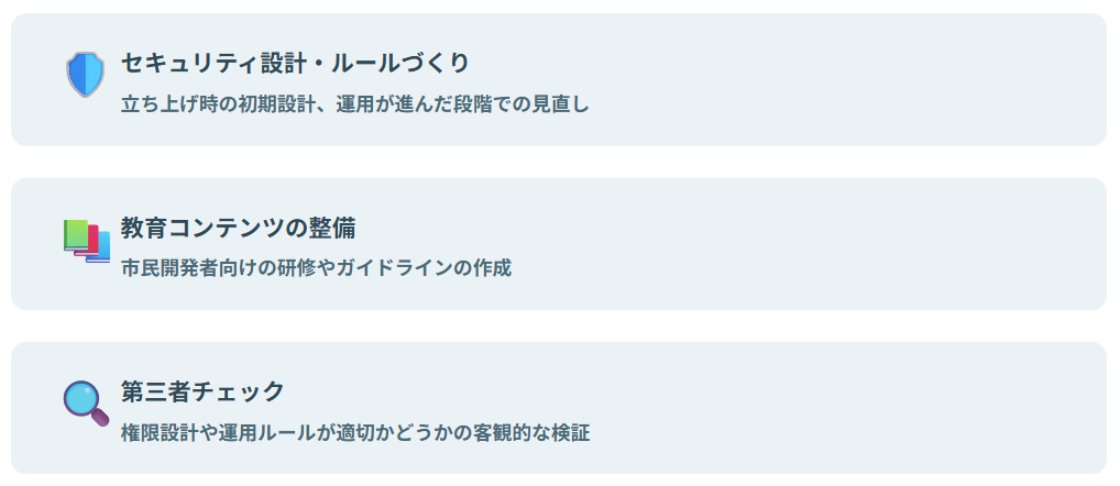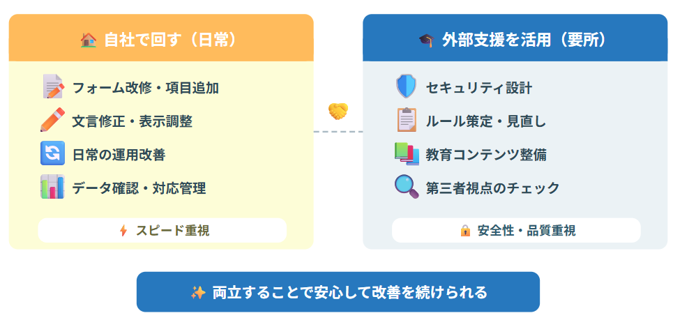 日々の改修は自分たちでやる。でも、セキュリティ設計やルールみたいな”土台の部分”はプロの力を借りる。その切り分けが上手にできると、現場も安心して動けるよね。
