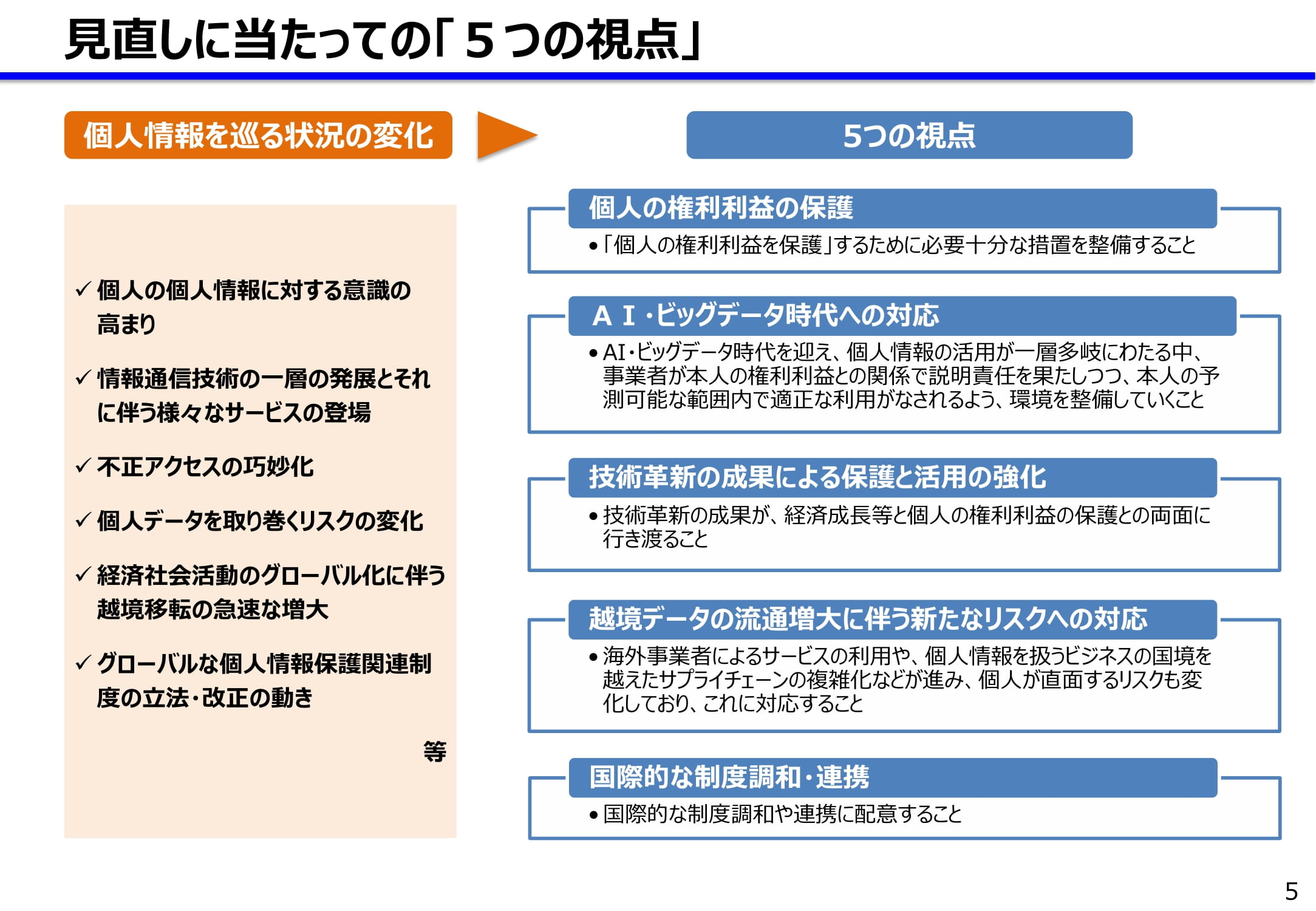 個人情報保護委員会によると、今回の改正は画像のような「5つの視点」で行われたそうです。