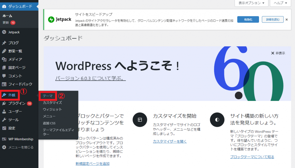 ■WordPress管理画面の【外観】から【テーマ】を選択します。