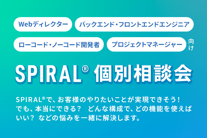 | 対象 | Webディレクター、プロジェクトマネージャー ノーコード開発者、ローコード開発者 バックエンドエンジニア、フロントエンジニア ご留意事項 個別相談会ではSPIRAL® アカウントがあると理想的です。 「SPIRAL ナレッジサイト」に会員登録していただくと、SPIRAL® アカウントとして「エンジニアβアカウント」(無償 / ビジネス利用不可)を申請できます。 ・「SPIRAL ナレッジサイト」ご案内 ・会員登録(エンジニアβ申請) |
