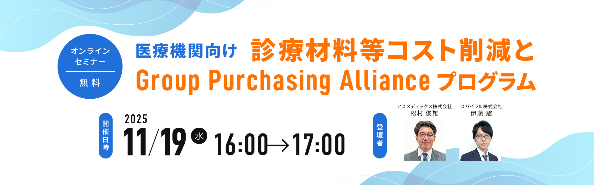 そのようなお悩みに応えるべく、本ウェビナーでは、診療材料等の費用削減の有効な手段として注目される「Group Purchasing Allianceプログラム(医療機関共同体としての費用削減支援)」の活用に焦点を当てます。数多くのコスト削減を手掛けるアスメディックス株式会社 松村様にご登壇いただき、Group Purchasing Allianceプログラムの活用事例を交えながら、実践的な削減・対策案をわかりやすく解説。